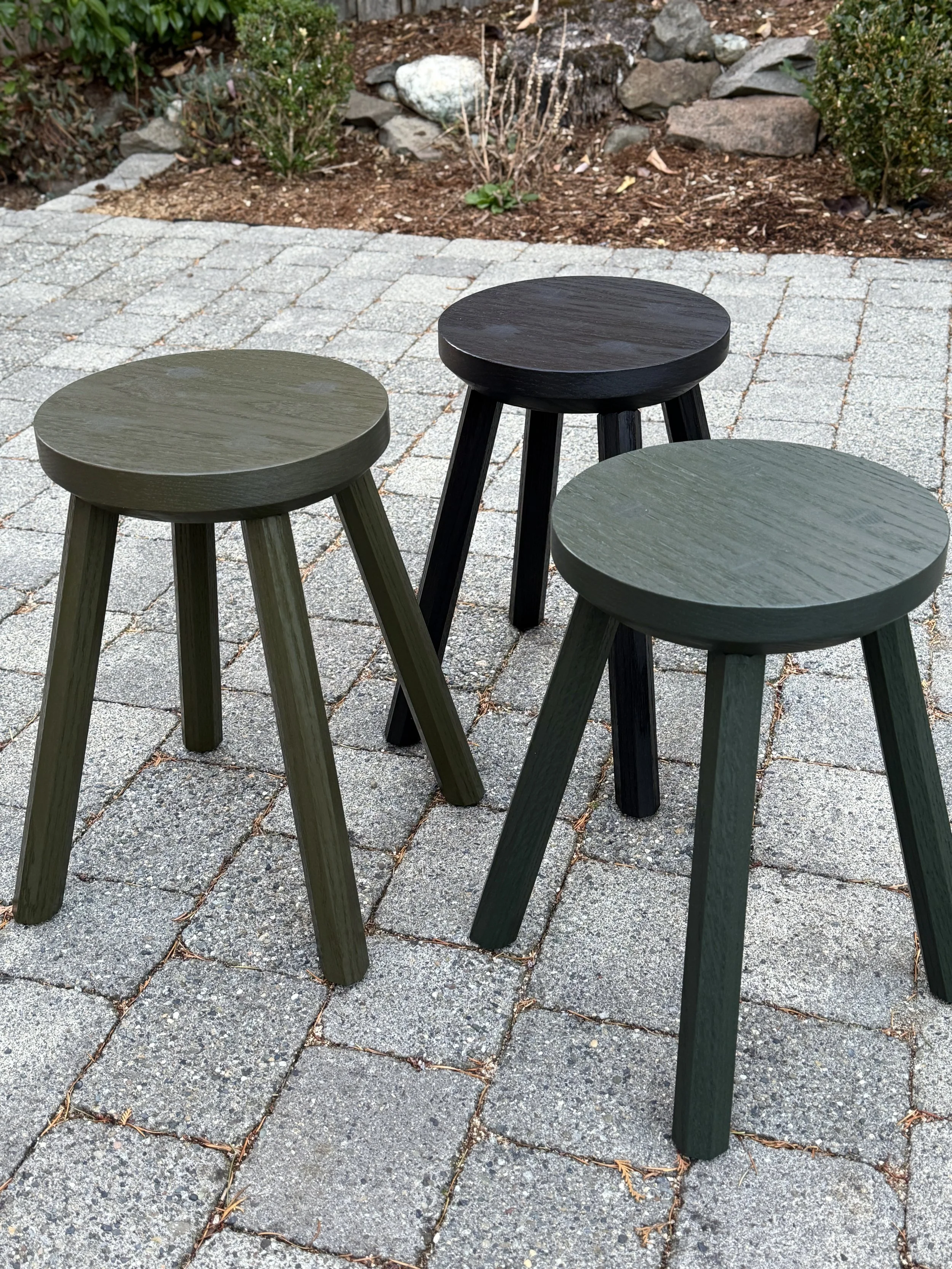 My stools are made from domestic woods, typically oak, ash, cherry and maple. The legs on a staked stool are carefully selected for straight grain and assembled with wedged mortises and tenon joinery. They are made to take a beating and can easily hold the weight of an average person. I finish them with soft wax, a finish that offers little protection but is easy to maintain and adds a beautiful shine, or linseed oil paint, a very durable and long lasting finish.